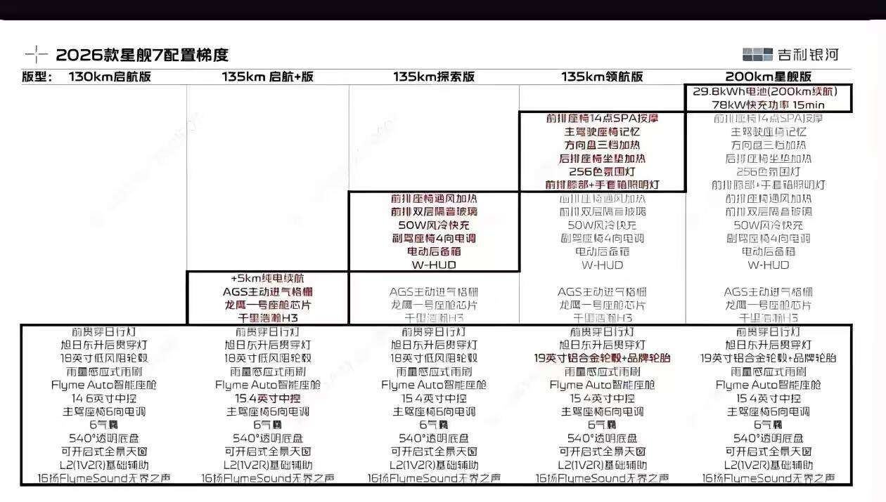 135km領航版繼續增加前排座椅14點按摩、主駕座椅記憶、方向盤/后排座椅加熱、256色氛圍燈、19英寸鋁合金輪轂等;頂配200km星艦版在135km領航版的基礎上升級29.8kWh電池組,純電續航達到200km,并支持78kW快充(現款為36kW),15分鐘可補能30%-80%。