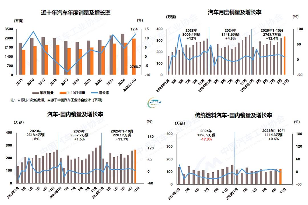 累計數(shù)據(jù)來看,汽車產(chǎn)銷分別完成2769.2萬輛和2768.7萬輛,同比分別增長13.2%和12.4%,產(chǎn)銷量增速較1-9月分別收窄0.1%和0.5%。