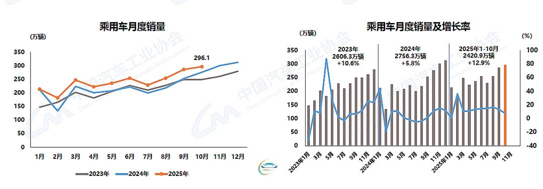 乘用車市場10月產(chǎn)銷分別完成299.5萬輛和296.1萬輛,環(huán)比分別增長3.3%和3.6%,同比分別增長10.7%和7.5%。累計產(chǎn)銷分別完成2423.7萬輛和2420.9萬輛,同比分別增長13.5%和12.9%。