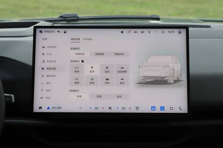 如果說硬核的四驅硬件配置是這臺車的肌肉,那么全地形管理系統就是它的大腦。智趣烈馬提供的8種駕駛模式,幾乎覆蓋了你所能遇到的所有路況:標準、運動、經濟對應日常使用,上下班通勤用標準或者運動模式,想省電就用經濟模式。泥地、沙地、濕滑、碎石路模式專治各種不服,而最讓人驚喜的是自動越野模式。