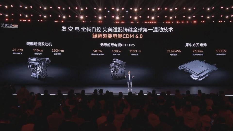 動力方面,獵鷹700版與光輝四驅版均搭載鯤鵬超能電混 CDM 6.0 系統,由1.5T發動機與電動機組成。具體數據如下:發動機最大功率:115kW(156馬力),單電機最大功率:275kW(374馬力),峰值扭矩:530N·m。