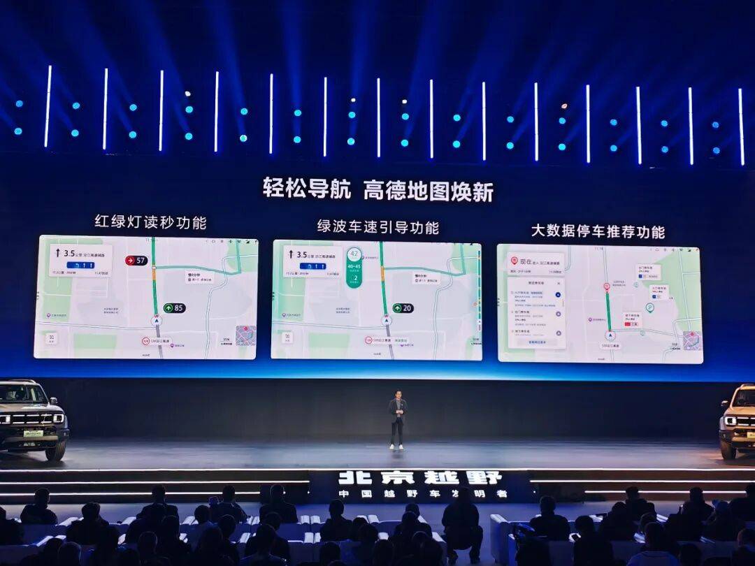 智能座艙方面,BJ40增程元境智行版配備兩塊15.6英寸高清液晶屏,是同級別中尺寸最大、分辨率最高的,還可實現主副駕雙屏聯動。車機搭載高通驍龍8155芯片,配備16GB運行內存和128GB存儲空間,算力強勁、存儲充足,徹底告別“車機卡頓”,支持AI語音情景式交互,蘋果CarPlay互聯,以及全新高德地圖的紅綠燈讀秒、綠波車速引導等實用功能。