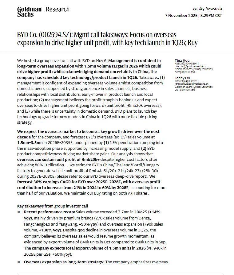 高盛在11月7日的研報(bào)中明確指出:海外市場(chǎng)將成為比亞迪未來十年的核心增長領(lǐng)域,依托完善的車型矩陣與強(qiáng)大的產(chǎn)品力,比亞迪2025年至2028年盈利年均復(fù)合增長率將達(dá)30%,海外利潤貢獻(xiàn)度將從2024年的21%升至2028年的60%,2026至2035年海外銷量有望達(dá)150萬至350萬輛,為此高盛堅(jiān)定維持其A股、H股“買入”評(píng)級(jí),A股目標(biāo)價(jià)144元人民幣,相較于12月9日收盤價(jià)仍有約50%上漲空間,體現(xiàn)出其對(duì)于比亞迪未來市場(chǎng)價(jià)值的高度認(rèn)同。