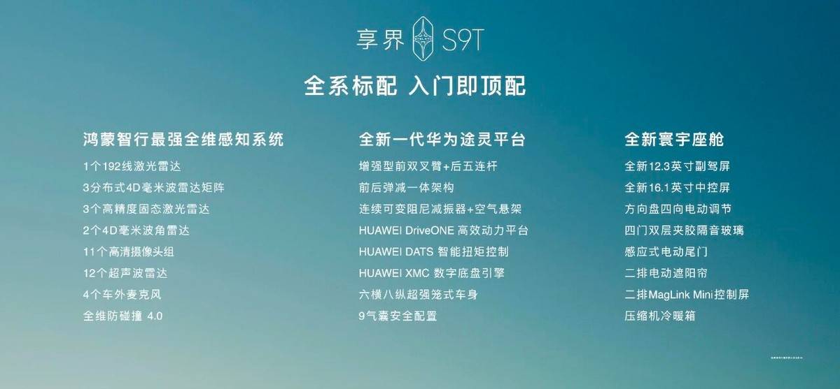 配置方面,享界S9T 搭載16.1英寸智能中控屏、12.3英寸副駕娛樂屏、全新MagLink Mini控制屏等超十屏智能座艙,帶來更流暢的人車交互體驗;新車標配華為悅彰音響卓越系列,采用專利雙振膜渦輪超重低音單元,隨享移動歌劇院。空間方面,車內乘坐空間高達1962mm,后排空間達1000mm;此外還有729L超大后備箱,后排放倒可拓展至1677L,裝載能力媲美SUV。