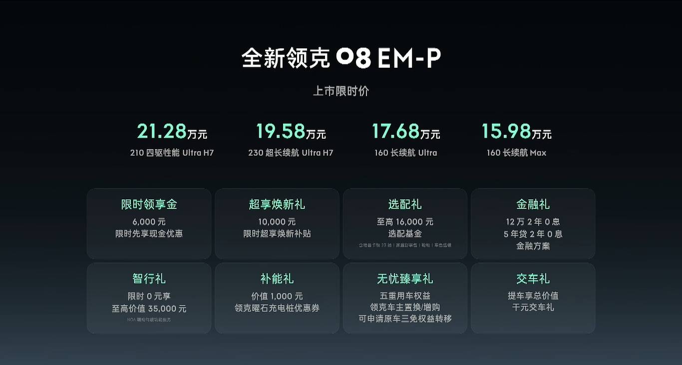 2025年9月24日,新款領(lǐng)克08 EM-P正式上市,共4款車型,售價區(qū)間17.58-22.88萬元,上市限時價15.98-21.28萬元。新款車型在外觀方面進(jìn)行調(diào)整,更凸顯運(yùn)動風(fēng)格,同時新增激光雷達(dá),在輔助駕駛方面將有提升。