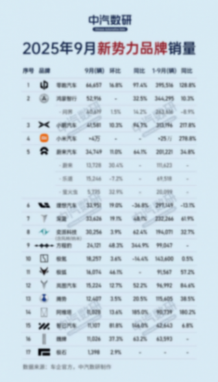9月份,新勢力品牌的角逐依然是車市一大看點。零跑以6.7萬輛交付量繼續領跑,同比翻番,連續7個月獲得新勢力品牌銷量冠軍;小鵬依靠MONA M03、P7系列持續放量,交付4.2萬輛,同比暴漲95%;小米汽車交付量突破4萬輛,快速躋身行業前列;蔚來交付3.5萬輛,同比增長64%,首次超越理想。與之形成對比的是,理想當月月交付3.4萬輛,相比去年4萬-5萬輛高點明顯乏力,隨著增程紅利的消退,其在高端新能源汽車市場所具有的優勢正在被削弱。