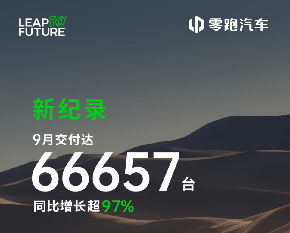 9月新勢力第一名依然是零跑汽車,并且月銷量首次超過了6萬輛,達到66657輛,同比增長超過了97%。
