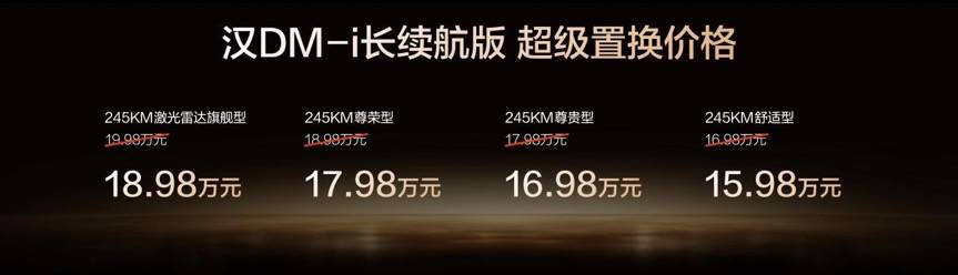 此次,漢DM-i長續航版共推出4款車型,補貼后售價15.98萬~18.98萬元;漢EV長續航版共推出3款車型,補貼后售價17.38萬~20.58萬元(10月31日前完成購車可享1萬元超級置換補貼)。同時,比亞迪還為用戶準備了包含置換補貼在內的至高價值3.8萬元七大禮遇。