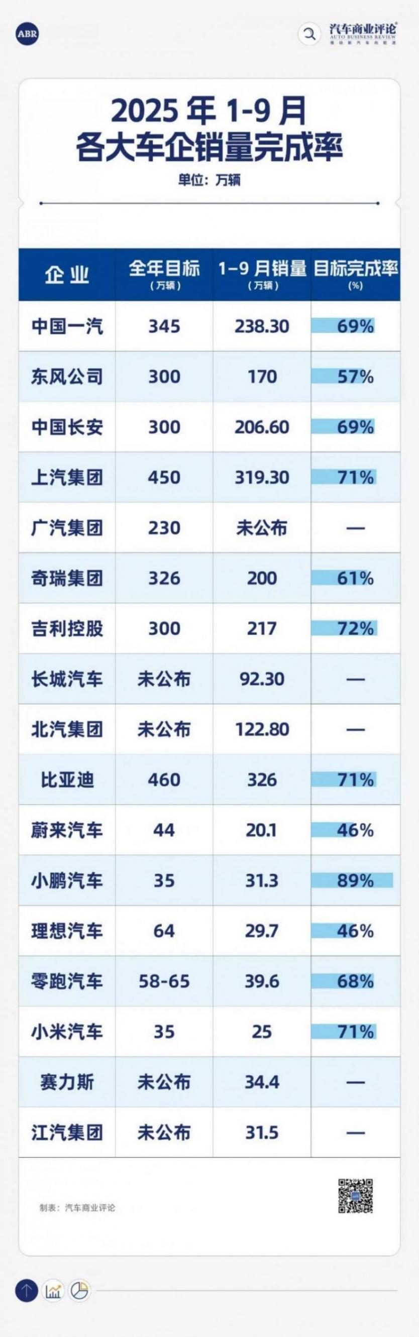 《汽車商業(yè)評(píng)論》整理了17家車企的2025年銷量目標(biāo)以及截至今年三季度的累計(jì)銷量。當(dāng)下環(huán)境,很難有企業(yè)能百分百完成既定銷量目標(biāo)。