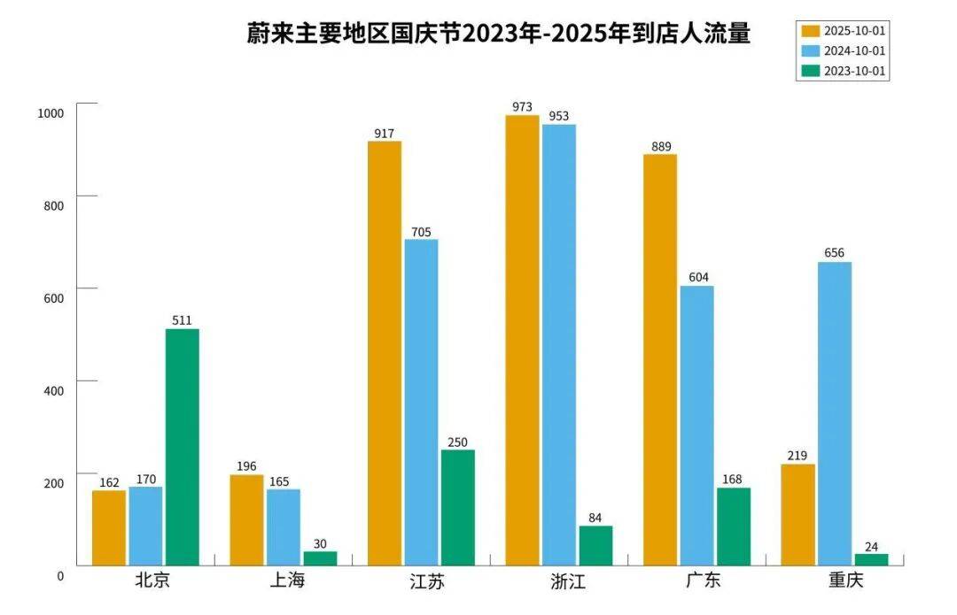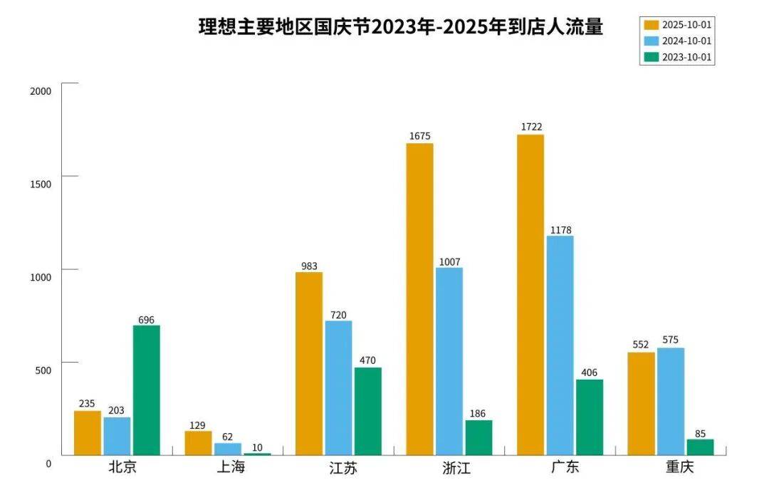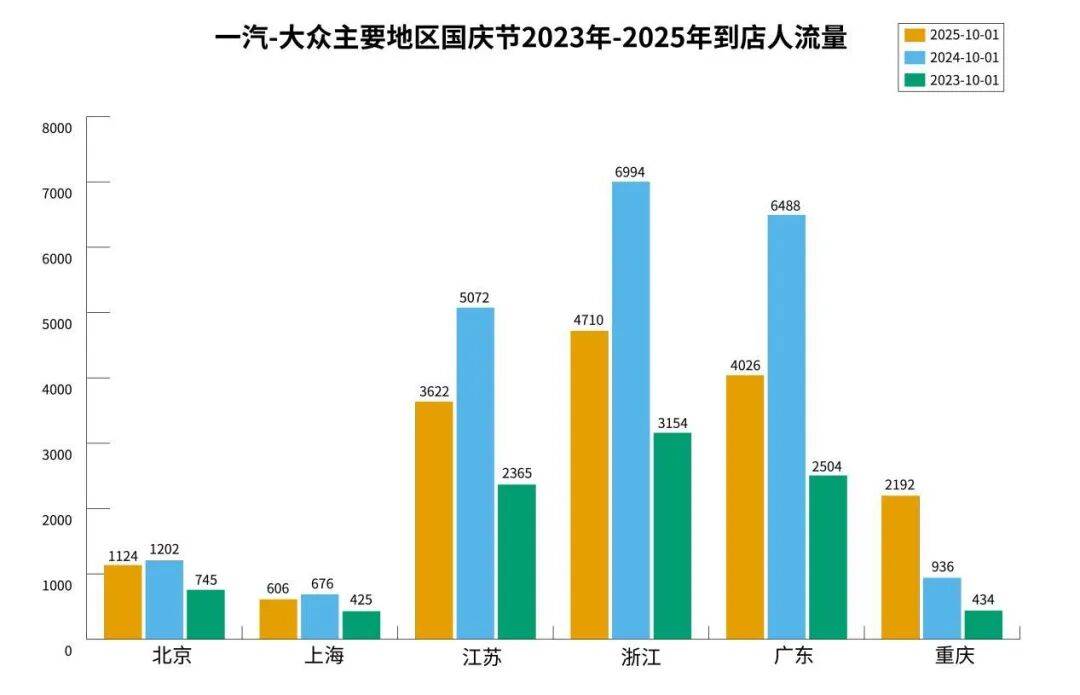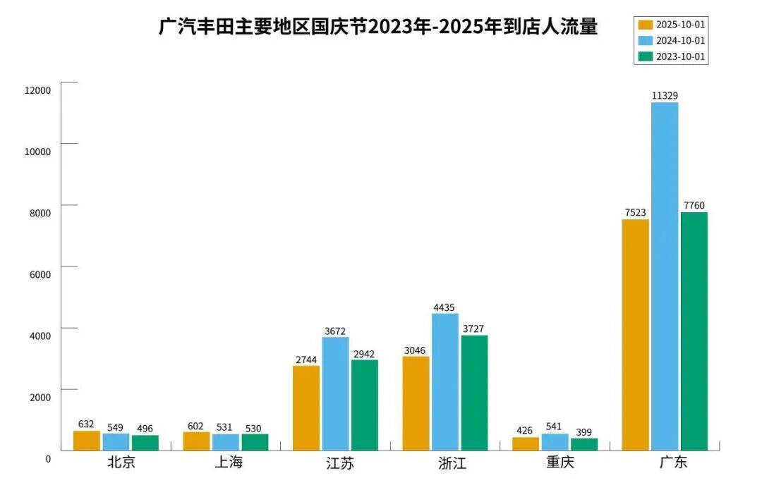 內(nèi)文中的柱狀圖分別是2025年10月1日、2024年10月1日和2023年10月1日北京、上海、廣州、江蘇、浙江和廣東各品牌4S店的到店客流,以人數(shù)為單位。