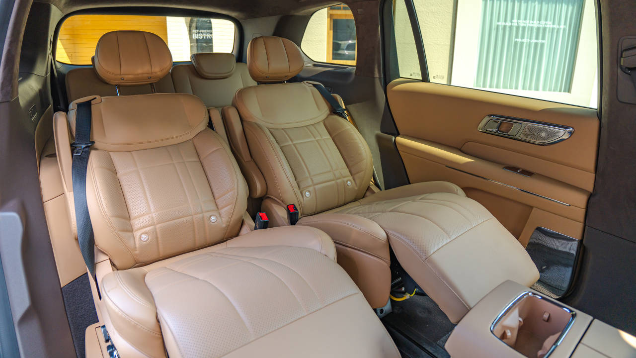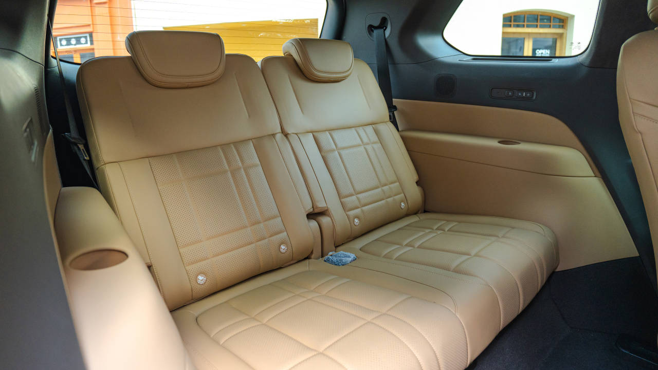 進入第三排,其實才是深藍S09與其他六座SUV真正出現差異化的地方。深藍S09的第三排可以有877mm的腿部空間,座椅也足夠寬大柔軟,完全沒有坐小板凳的既視感。配合電動靠背調節,身高170cm的成年人也完全可以在第三排葛優躺,這使得第三排不再是應急之需,而是真正可以長時間乘坐的舒適座椅。另外第三排座椅也有扶手、杯架以及加熱功能等等,唯一的問題是第三排沒有頂棚拉手。