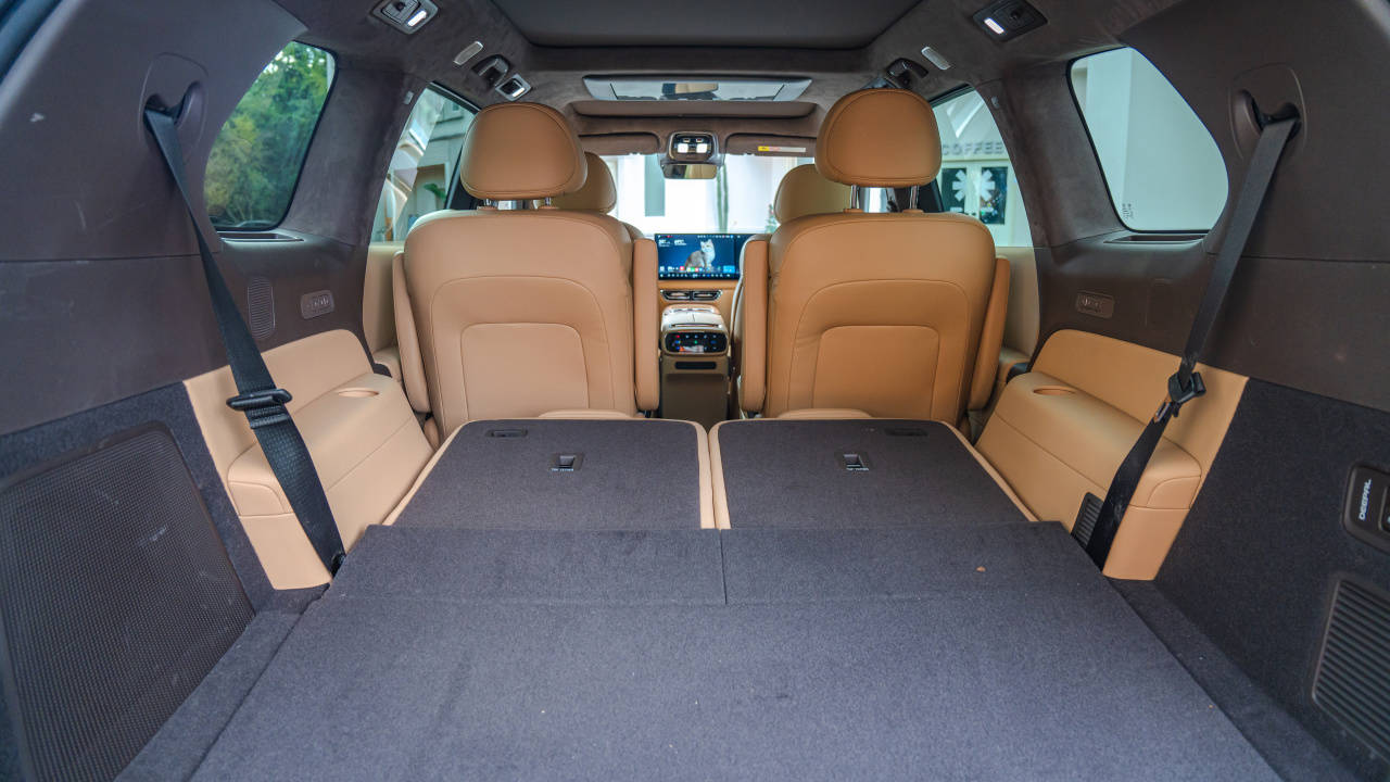 深藍S09的二排還有很值得說的一點,市面上有些5米多的中大型SUV車型,在放倒第三排后,第二排是不能當大四座使用的,因為靠背會被第三排擋住。但深藍S09放倒第三排后,第二排座椅依然可以保持非常仰躺的姿勢。
