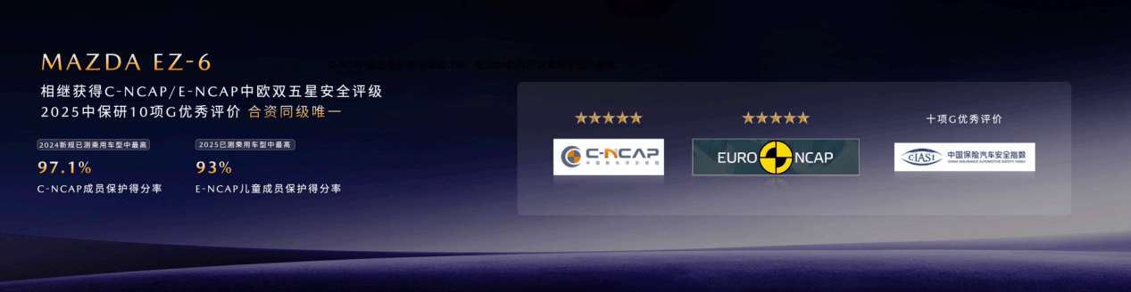 10月15日,歐洲新車安全評鑒協會(Euro NCAP)公布最新安全評級,EZ-6全球化車型MAZDA 6e以成人乘員保護93%、兒童乘員保護93%的優秀得分率,斬獲E-NCAP五星認證。成人成員保護得分率創馬自達歐洲市場車型歷史新高,兒童乘員保護得分率位列所有參與測試車型第一名。