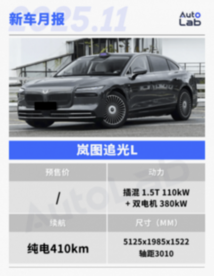 嵐圖追光L定位中大型插混轎車,它基于800V高壓平臺打造,匹配63度5C電池,純電續航來到了410km;同時其在底盤部分還配備了雙腔空氣懸架和后輪轉向系統。