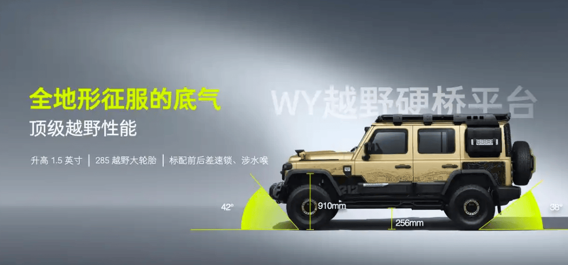 全副武裝的越野性能則是其核心優勢。T01高地基于專業WY越野硬橋平臺打造,采用非承載式車身+前后硬橋結構,車身升高1.5英寸,匹配全地形輪胎,標配前后差速鎖與涉水喉,達成42°接近角、38°離去角、910mm涉水深度的頂級通過性。